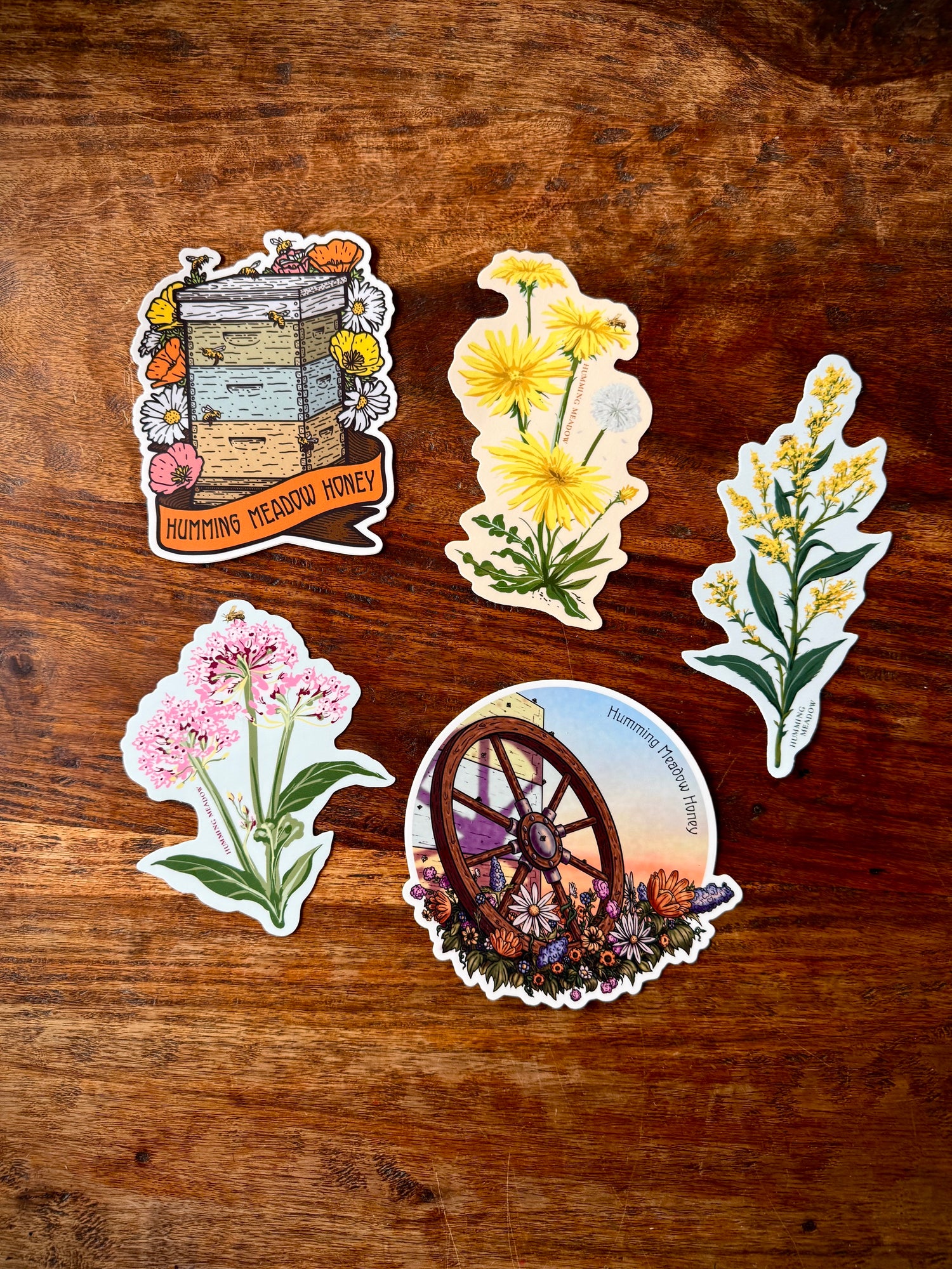 Every purchase from Humming Meadow Honey includes a large, five-inch sticker tucked inside. It might feature the wildflowers that grow through our meadow, a beehive rendered in our familiar hive colors, or another small piece of the place these jars come from.