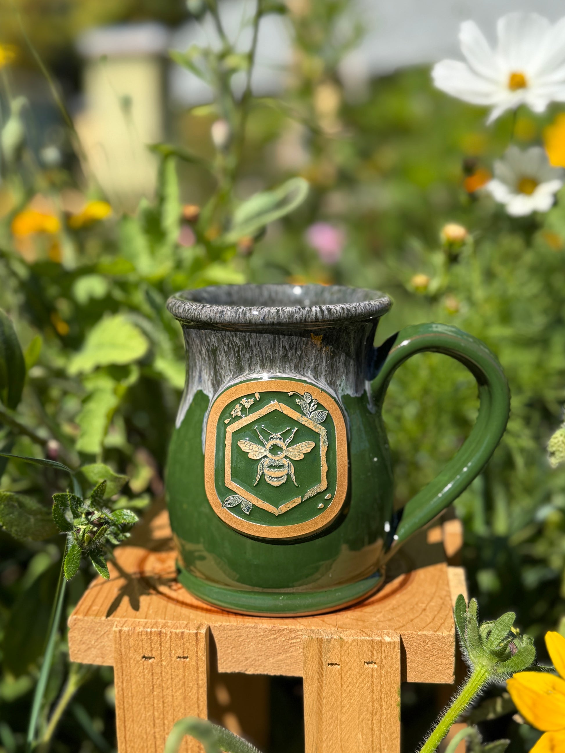 These beautiful 12 oz. mugs feature the Humming Meadow Honey logo and come in two shapes (straight or rounded) and three color choices (solid green, green with dark glaze, or green with light glaze). They are handmade by Deneen Pottery, a family owned studio in St. Paul, Minnesota. Mugs are dishwasher, oven, freezer, and microwave safe. They are lead free.